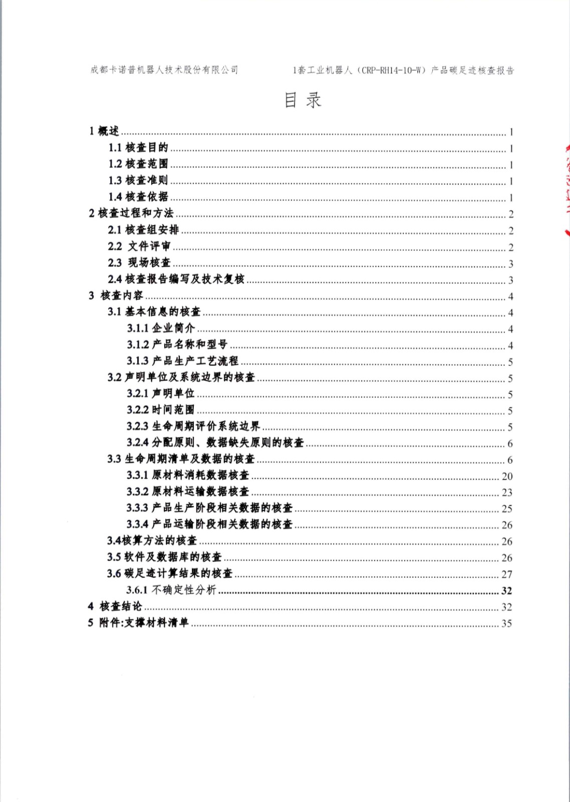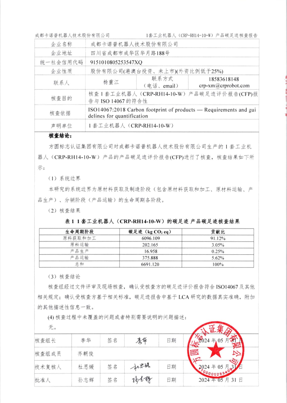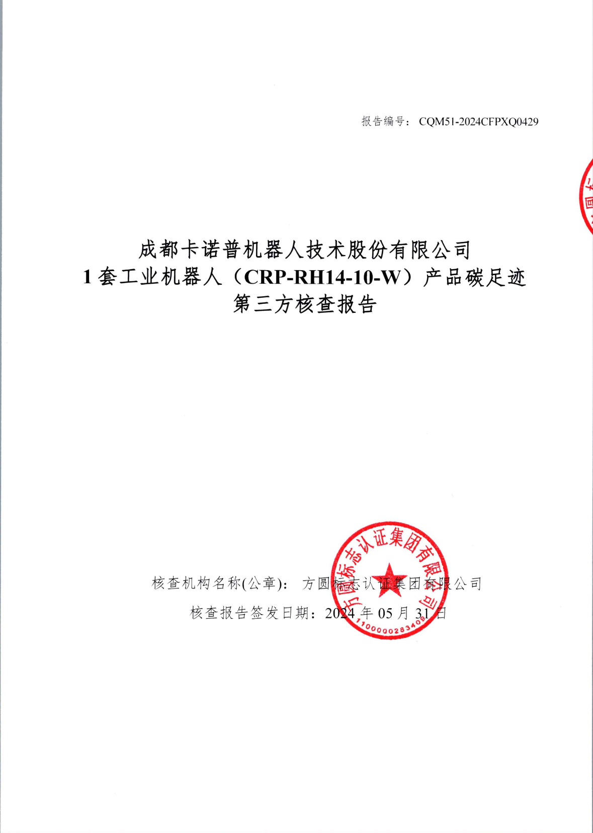 成都星空電競機器人技術股份有限公司1套工業(yè)機器人(CRP-RH14-10-W)產品碳足跡第三方核查報告