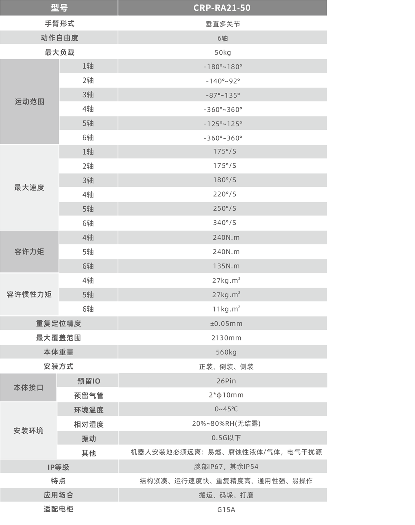 運(yùn)行速度快,重復(fù)定位精度,適用于搬運(yùn)、裝配、打磨等場(chǎng)景。